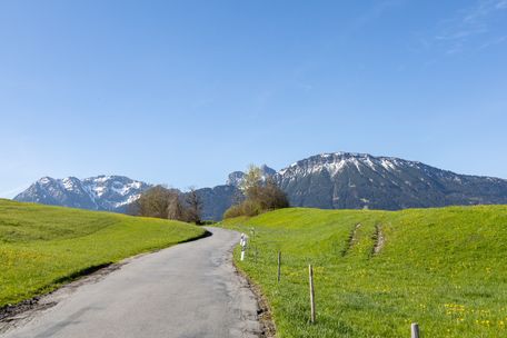 Bei Überquerung der Straße beginnt die anspruchsvolle große R15 Stiefenhofener Runde ( 8,3 km) mit Blick zum Hochgrat und Säntis.