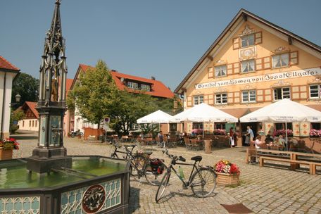 In der Kreisstadt lässt sich beispielsweise auf den Spuren des beliebten Kurfürsten Clemens Wenzeslaus wandeln. Das ehemalige Fürstbischöfliche Schloss (heute Bayerische Musikakademie) und die fast zwei Kilometer lange Lindenallee mit 620 Linden laden zu einem aussichtsreichen Abstecher ein. Wir verlassen Marktoberdorf in Richtung Ebenhofen und Biessenhofen. An den Bahngleisen entlang erreicht die Radrunde Kaufbeuren.