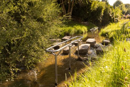 Wanderung zum Illererlebnissteg mit Aussichtsturm und Blick auf den Illersteilhang sowie Kneipptretanlage und Picknickplatz.